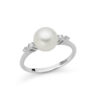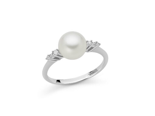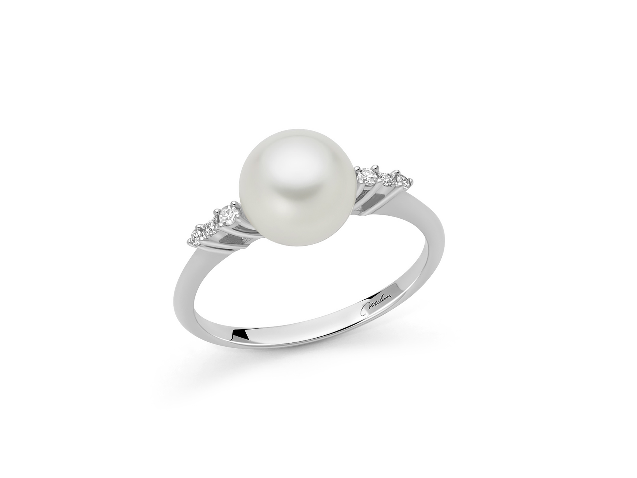 Anelo in oro 750/1000, quindi composto per il 75% da oro puro che lo rende di alta qualità. È decorato con sei diamanti naturali, con un peso totale di 4,92 carati, classificati come di colore G e purezza SI, il che indica che sono di ottima qualità. Caratterizzato da perle vere di colore bianco, con un diametro di 8-8,5 mm.