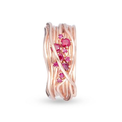 Dieci fili in Oro Rosa 18kt egregiamente intersecati tra loro, racchiudono nel centro dellāanello 10 Rubini 0.40 ct. Lāispirazione per questo modello viene dal Melograno, quando il frutto ĆØ maturo si spacca e ne esce la luce rosso Rubino dei suoi chicchi.