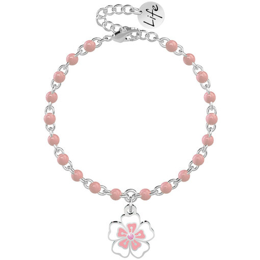 Bracciale donna Kidult Nature 731834 in acciaio con ciondolo a fiore di ciliegio smaltato e catena rolò con inserimenti in smalto rosa. Gioiello con smalti colorati e cristallo sul ciondolo e inserimenti in smalto sulla catena. La frase incisa è: i fiori di ciliegio riempiono di rosa la nostra vita. Per te rinascita, prosperità e purezza durante l’hanami di primavera.