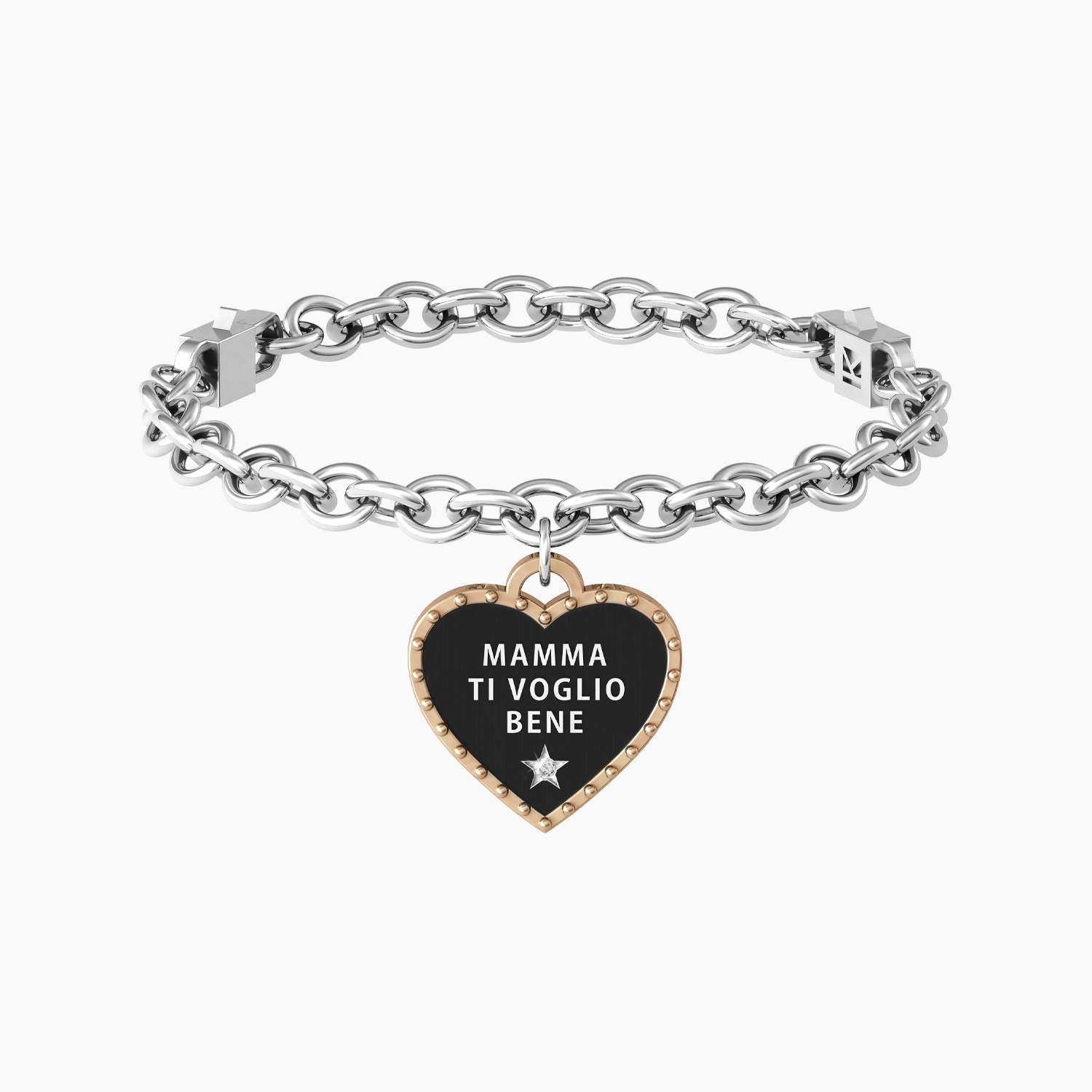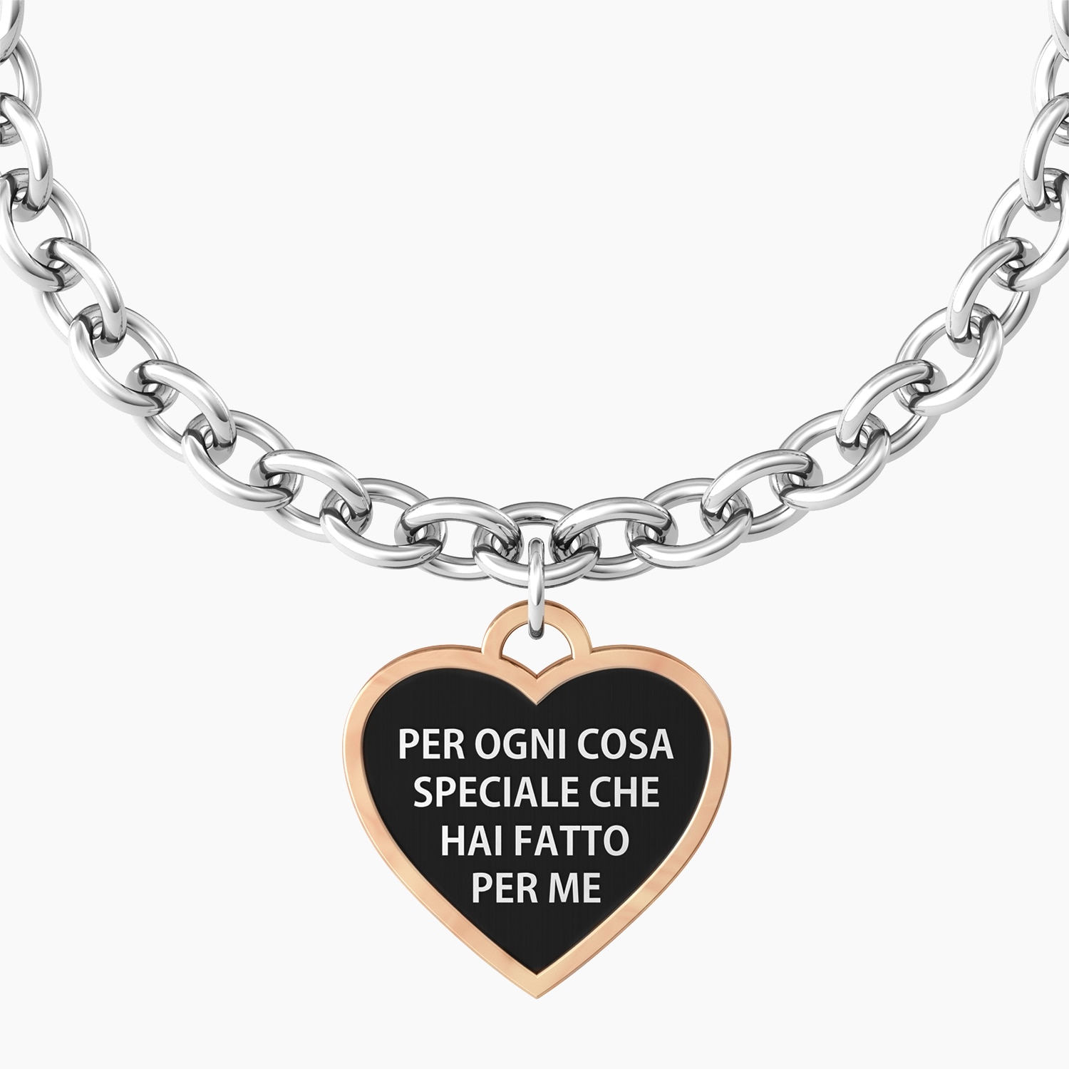 Bracciale in acciaio con catena rolò “comfort fit” e ciondolo satinato nero a cuore con rifinitura borchiata color oro rosa e cristallo.