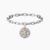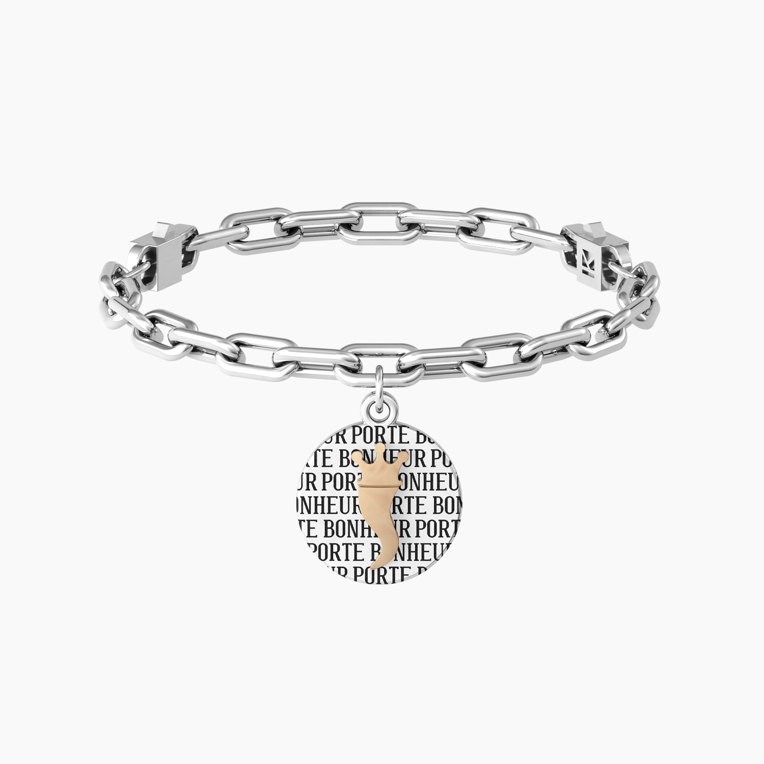 Bracciale in acciaio con catena a maglie ovali “comfort fit” e ciondolo lucido tondo con cornetto in rilievo color oro rosa e cristallo.
