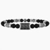 Bracciale elastico con pietre alternate in agata nera e agata grigia alternate e charm in acciaio con scritta “Buona fortuna”.