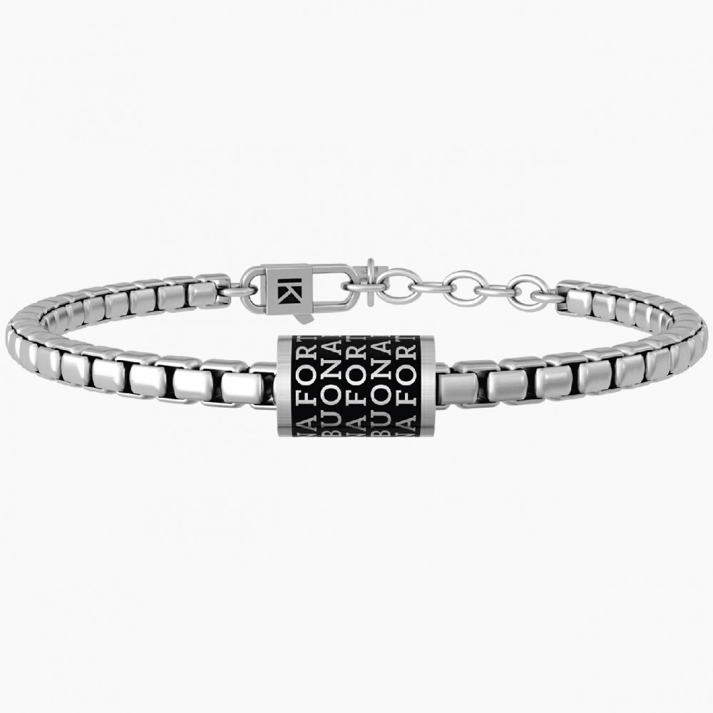 Bracciale in acciaio con catena veneta satinata e charm nero con scritta “Buona fortuna”.