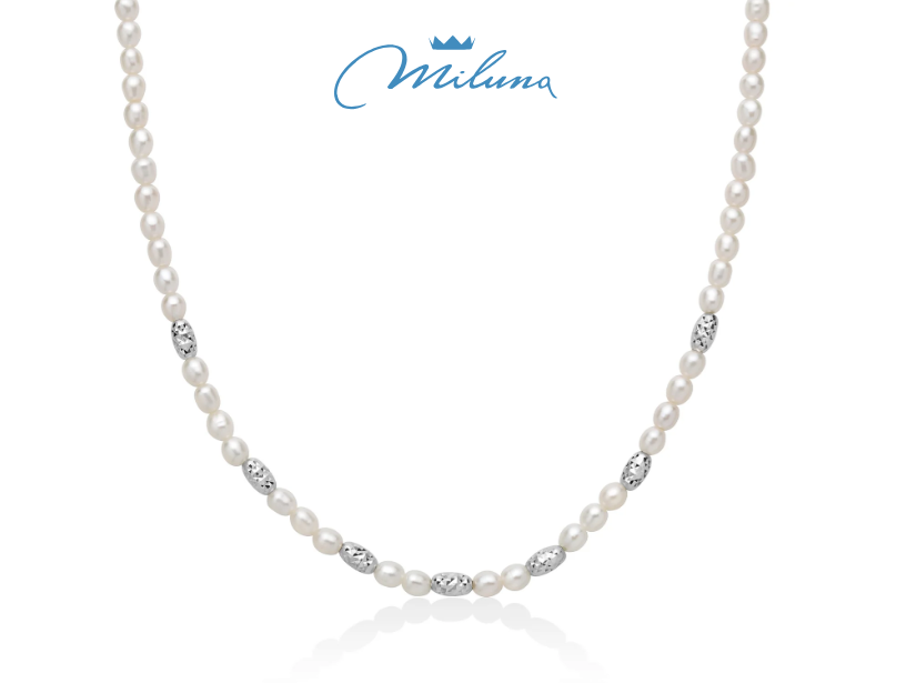 Scopri l’eleganza senza tempo con questa collana di perle della Miluna, con vere perle dell’Oriente di dimensioni 4-4,5 mm. Ogni perla è un capolavoro della natura, lucente e unica, che cattura la luce in modo incantevole. Realizzata con cura con cinque inserti in argento 925, questa collana non è solo un accessorio, ma un vero e proprio simbolo di classe e raffinatezza. Perfetta per ogni occasione, dal brunch con le amiche a una serata elegante, aggiungerà un tocco di sofisticatezza al tuo look. Indossa la bellezza delle perle e lascia che il tuo stile parli di te!