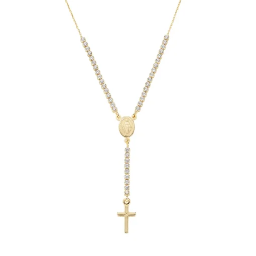 Questa elegante collana unisex è realizzata in argento con finitura dorata, dal colore bianco brillante. Il design stile rosario è impreziosito da zirconi bianchi che aggiungono luminosità e raffinatezza. La lunghezza regolabile tra 38 e 46 cm la rende comoda e versatile, perfetta per chi cerca un accessorio simbolico e di stile. Un gioiello delicato e significativo, adatto a tutti.