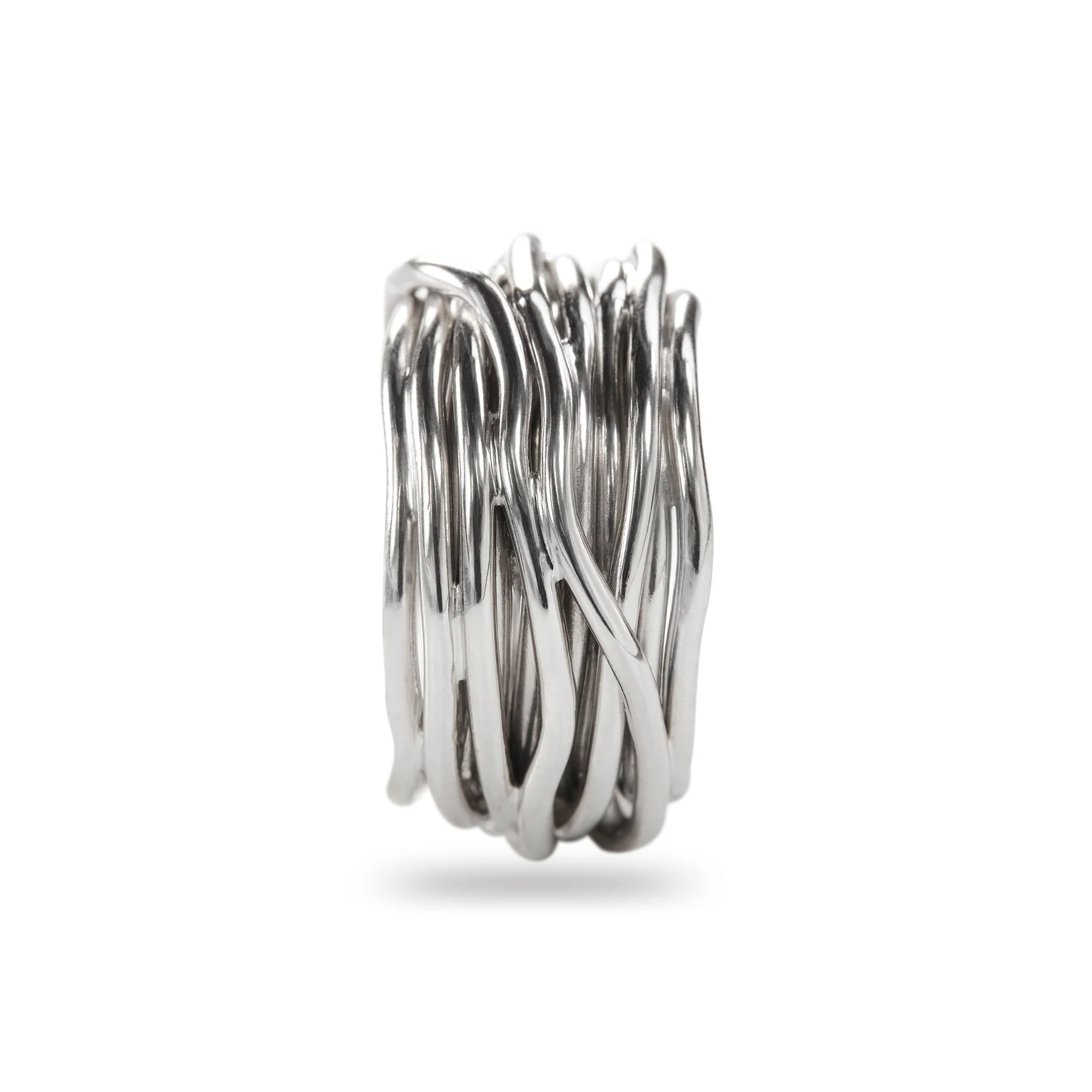 Tredici fili in Argento 925 arricchito al Palladio si intrecciano per formare un anello unico e audace adatto sia per lui che per lei, un gioiello realizzato esclusivamente con materiali con certificazione etica.