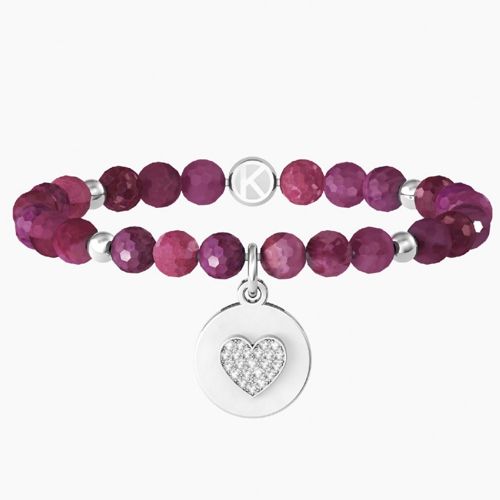 Kidult – Love Bracciale elastico con agata fucsia e ciondolo tondo in acciaio satinato, cuore con cristalli bianchi