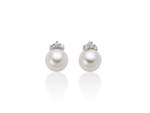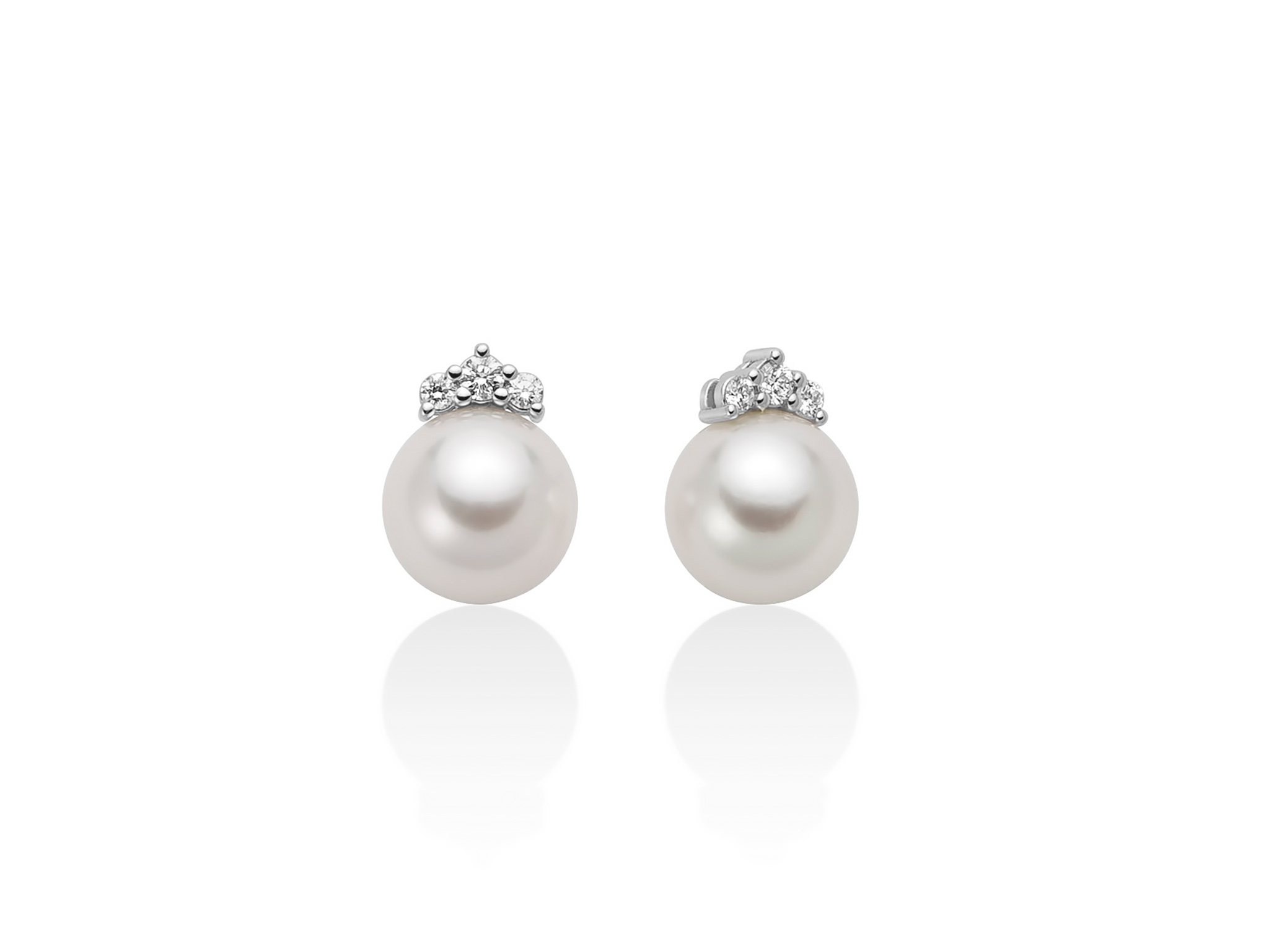 Questi eleganti orecchini in oro 750/1000 (18 carati) sono arricchiti da 6 diamanti naturali con un peso totale di 8 carati, classificati come G per la purezza e SI per la chiarezza, con un raffinato taglio brillante rotondo. A completare il design sofisticato, due perle vere Akoya Antiqua di selezione speciale, di colore bianco e con un diametro di 7,5-8 mm.
