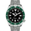 Orologio con movimento automatico Miyota 8215. Cassa in acciaio diametro 42mm. Spessore cassa 14 mm. Fondo in acciaio serrato a vite. Vetro zaffiro. Ghiera girevole unidirezionale in acciaio smaltata verde. Quadrante nero. Cinturino in acciaio maglia jubilee con chiusura sportiva di sicurezza, larghezza anse 2,1 cm, lunghezza 18 cm. Datario giorno del mese a ore 4 con lente. Water Resistant 20 Atm.