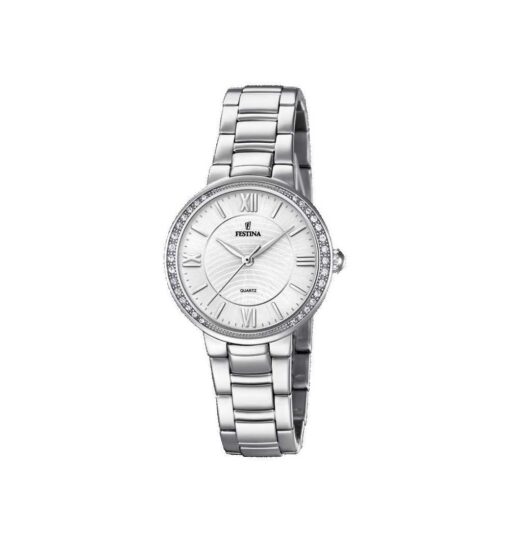 Orologio Festina da donna della collezione Petite con movimento al quarzo Miyota GL30 e funzioni di solo tempo. Cassa rotonda in acciaio inox dal diametro di 30 mm e spessore di 7,3 mm con quadrante analogico silver a tre lancette; ha indici a bastoni, indici a numeri romani alle ore 3, 6, 9 e 12, logo festina nella parte alta. La cassa ĆØ impreziosita da splendidi cristalli bianchi. Vetro di tipo minerale. Il cinturino ĆØ realizzato in acciaio inossidabile e anallergico con chiusura deployante. Resistente all’acqua fino a 50 metri di profonditĆ .