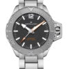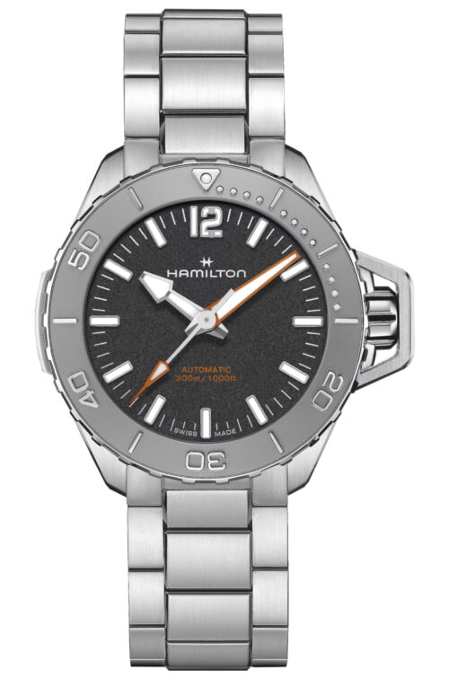 Il Khaki Navy Frogman Automatic si distingue per le prestazioni tecniche e l’iconico design. La sua cassa in acciaio da 41 mm è dotata di una corona a vite protetta da un robusto copricorona a forma di ponte per garantire l’impermeabilità fino a 30 bar (300 m), un omaggio al design del Frogman originale. Il Khaki Navy Frogman Automatic da 41 mm vanta un quadrante nero con Super-LumiNova® applicato su indici e sfere per garantire una lettura precisa in qualsiasi circostanza e un imponente bracciale in acciaio. Funzionale ed estremamente pratico, questo segnatempo è l’alleato perfetto per le tue avventure in mare e sulla terraferma.