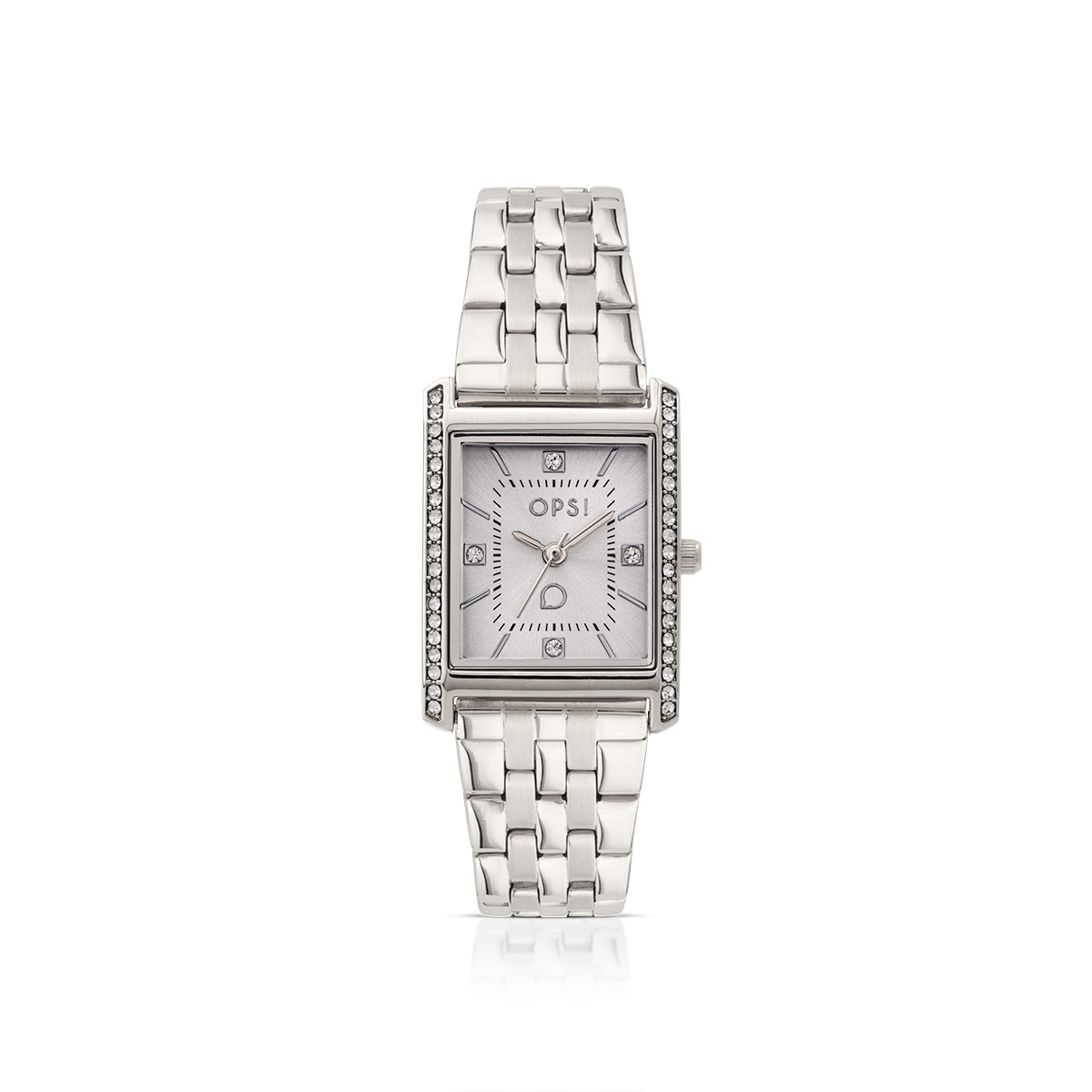 L’Orologio da Donna della marca Ops Object presenta un elegante design con meccanismo al quarzo solo tempo. La cassa rettangolare in acciaio, di dimensioni 28 x 21 mm, è impreziosita da zirconi bianchi incastonati ai lati, aggiungendo un tocco di raffinatezza. Il vetro in minerale piano protegge il quadrante argenté con finitura lucida, mentre le lancette in acciaio e gli indici decorati con zirconi bianchi conferiscono un aspetto sofisticato. Il cinturino in acciaio a cinque elementi alterna lavorazione lucida e satinata, offrendo comfort e stile. La chiusura doppia deployante garantisce sicurezza, mentre la corona a trascinamento permette una facile regolazione dell’ora. Resistente all’acqua di 5 ATM.