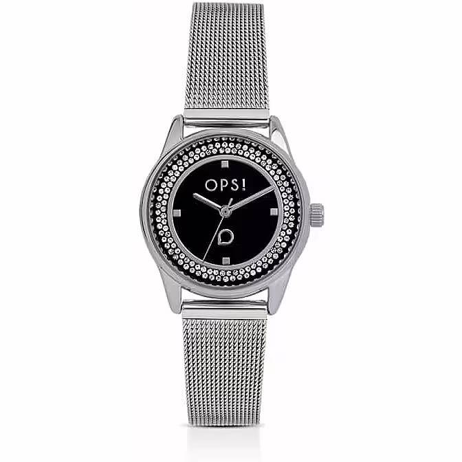 Eleganza sofisticata in ogni dettaglio. Cassa in acciaio da 28 mm con quadrante nero, indici in pietre e cinturino argentato con chiusura a scatto. Un orologio trendy e luminoso, perfetto per chi ama brillare con stile.