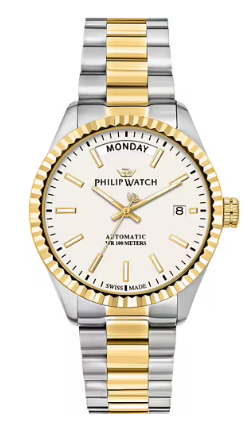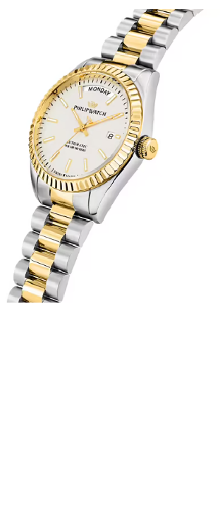 Il cinturino in acciaio, con un elegante tono che mescola oro e acciaio, ĆØ arricchito da una fibbia farfalla con pulsanti che garantisce una chiusura sicura e comoda. La combinazione di materiali e colori, insieme alla sua solida struttura, rende il Philip Watch Caribe un orologio versatile e di alta qualitĆ , ideale per chi cerca un pezzo Swiss made che coniuga eleganza e funzionalitĆ in un solo orologio.