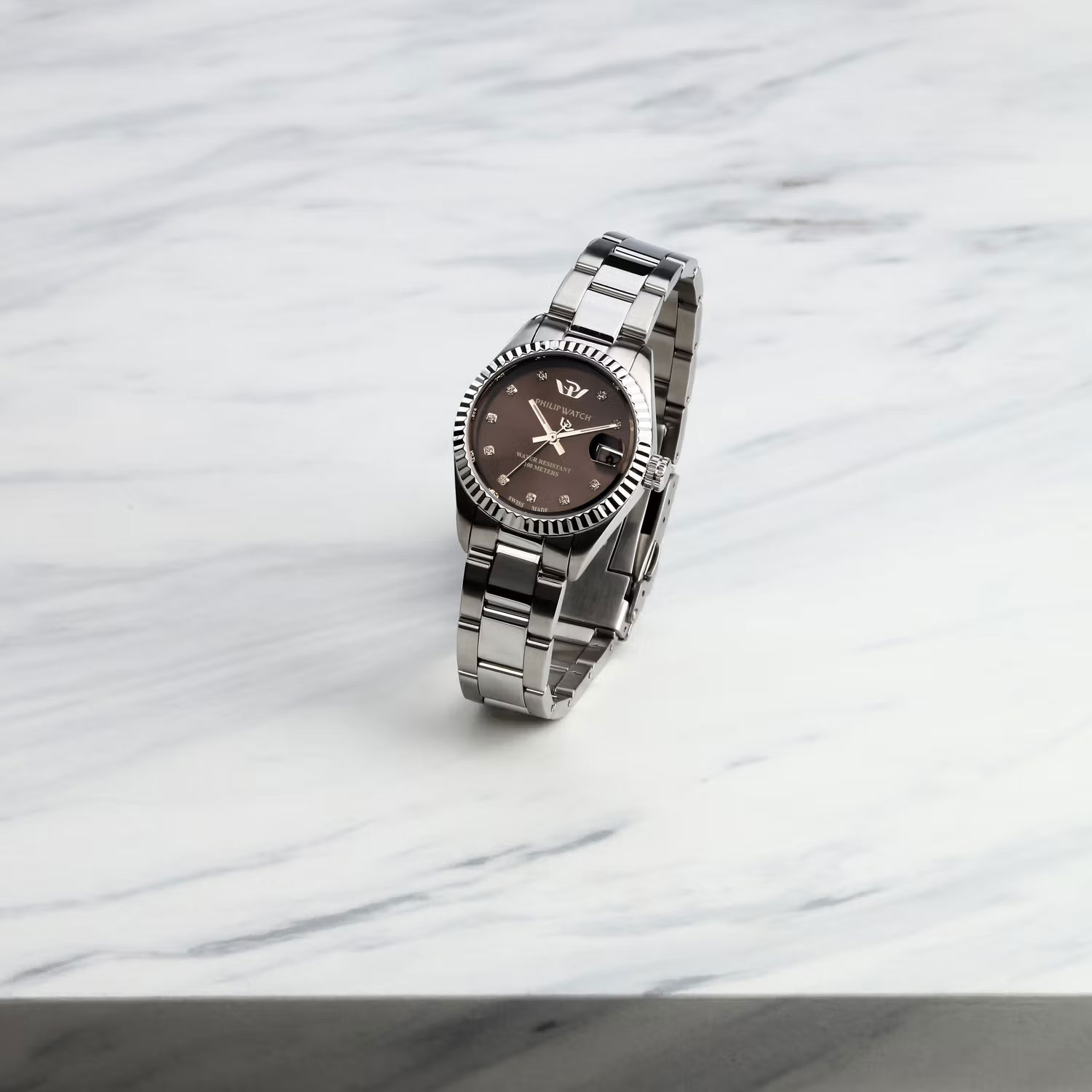 Materiale e finitura cassa: Acciaio, Diamanti, Misura cassa: 31.00mm, Spessore cassa: 9.15mm, Finitura cassa: Lucido, satinato, Colore cassa: Silver, Vetro: Vetro zaffiro, trattamento antiriflesso, Materiale cinturino: Acciaio, Colore cinturino: Silver, Chiusura: Fibbia diver c/pulsanti e blocco di sicurezza, Swiss made: Sì, Water resistant: 10 atm, Garanzia: Ufficiale 2 anni Philip Watch, Confezione: Originale Philip Watch