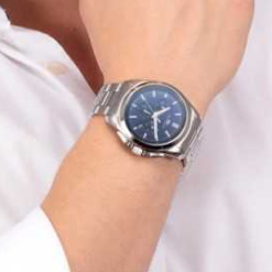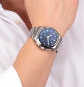 QuadranteĀ analogico blu con indiciĀ a bastoni, numeri arabi a ore 6 e 12 eĀ datario a ore 4. VetroĀ zaffiro.